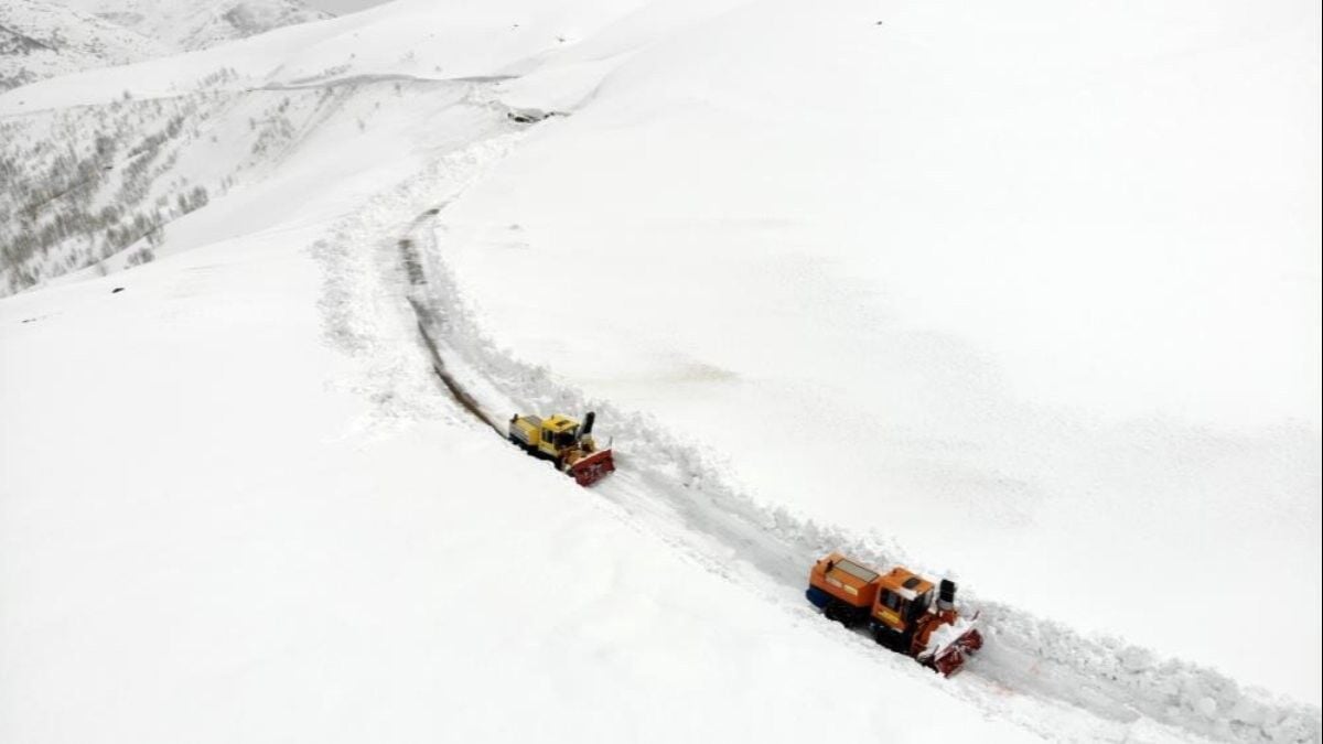 Kar kalınlığının 8 metreyi bulduğu sarp dağların arasında ilerleyen ekipler, karlı dağları çığ riskine karşı adım adım aşıyor. İş makinelerinin geçtiği bölgelerde kardan tüneller oluştu.