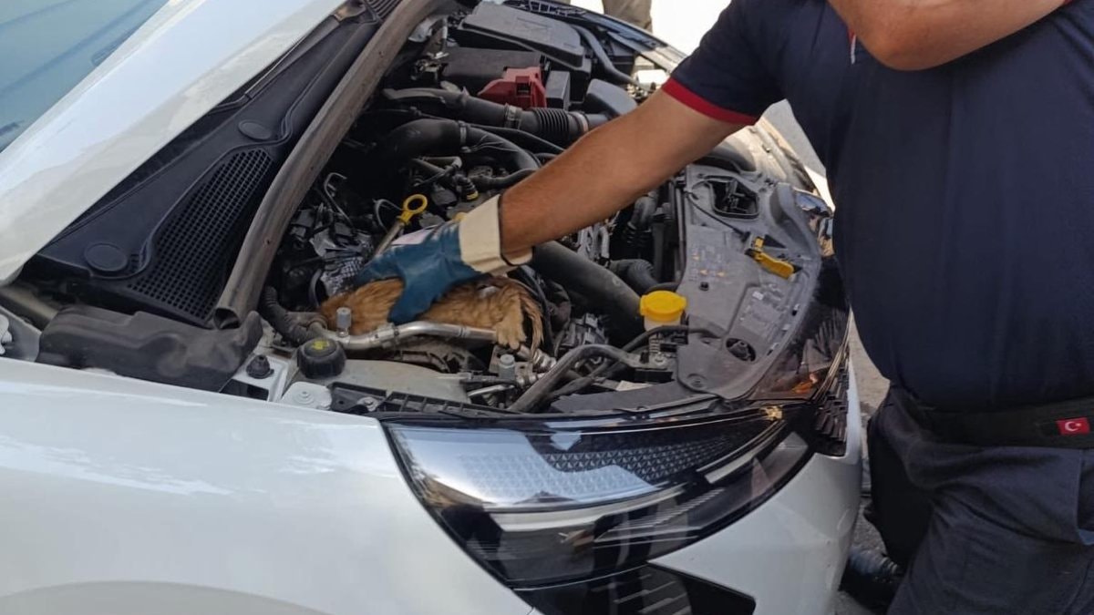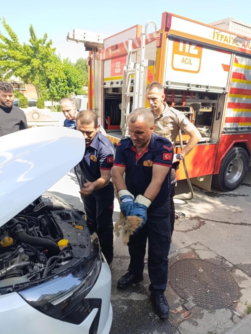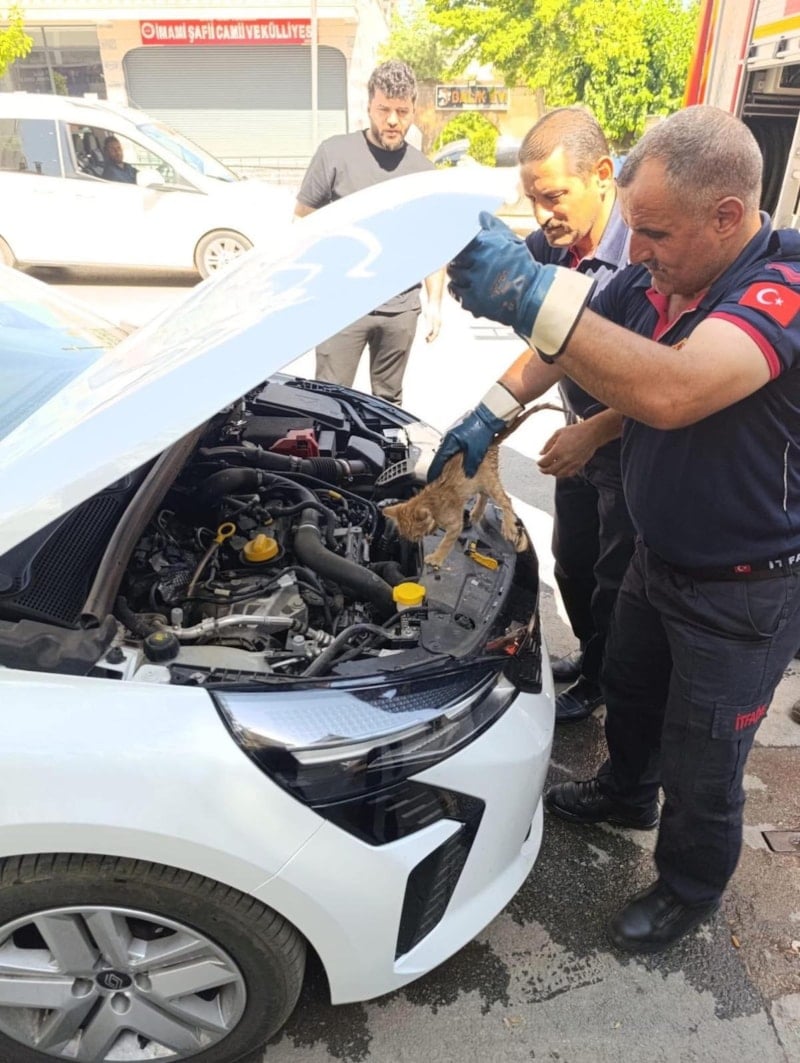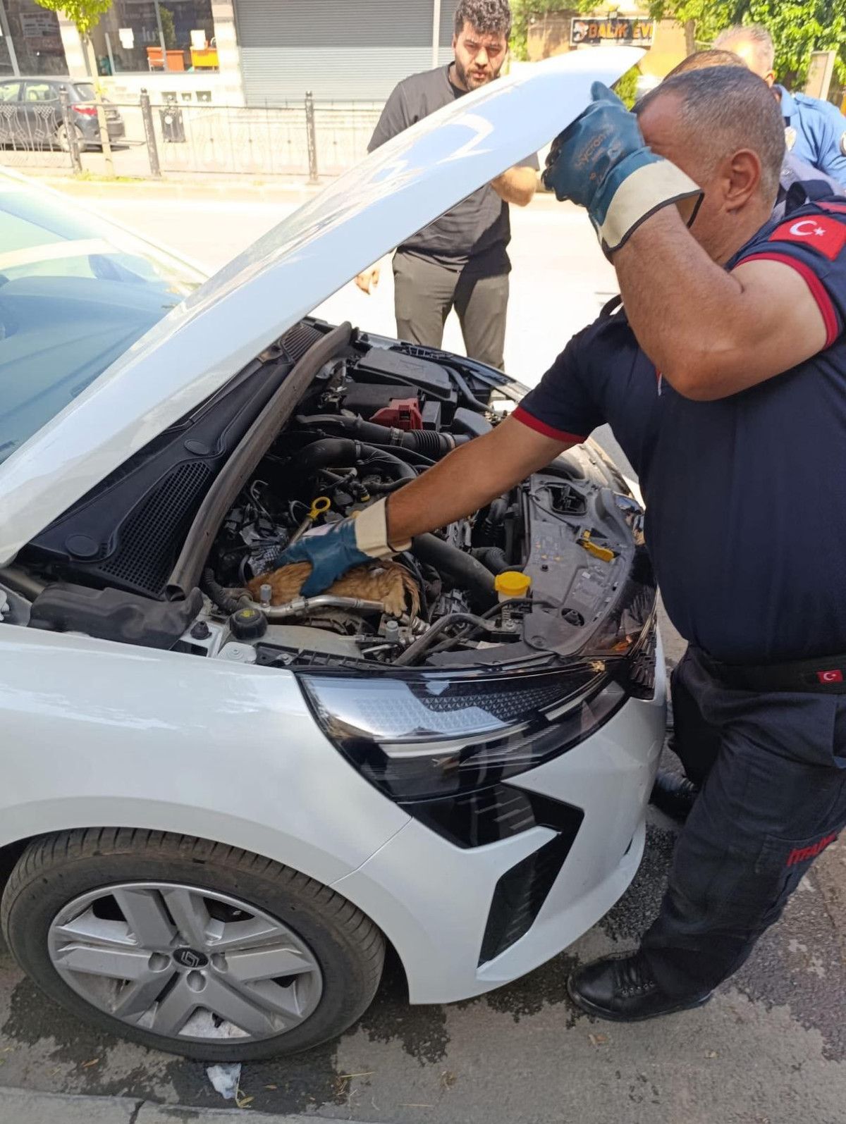 Aracın kaputunu açarak çalışma başlatan ekipler, motor bölümüne sıkışan yavru kediyi dikkatli bir şekilde bulunduğu yerden çıkardı.