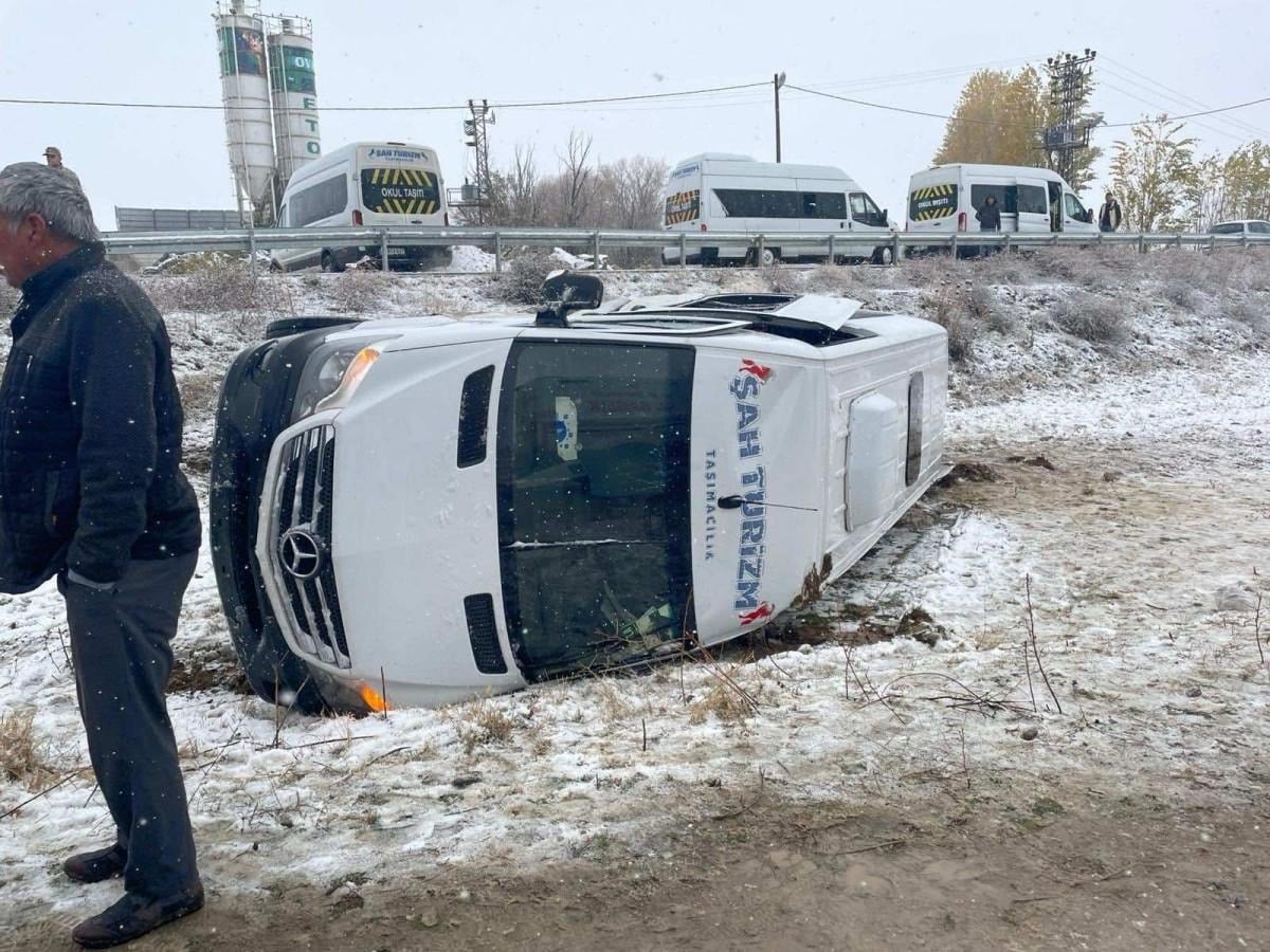 Kaygan yolda birkaç metre sürüklenen minibüs, ardından yola devrildi.