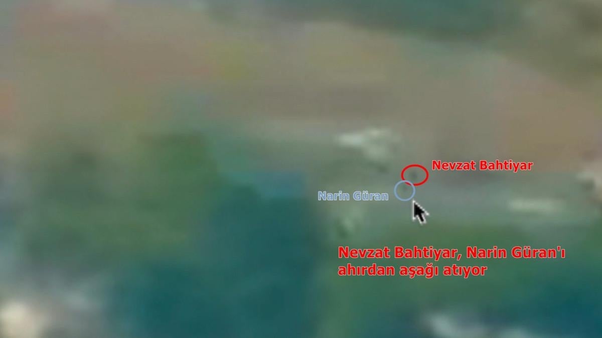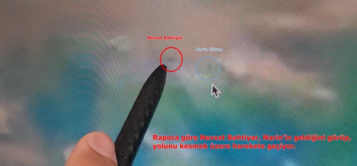 Narin’in daha sonra patikaya ilerlediği, patikada yürüdüğü sırada Nevzat Bahtiyar’ın evinin yakınında insan benzeri büyük bir gölge tespit edildiği, bu gölgenin Nevzat Bahtiyar’a ait olma ihtimalinin yüksek olduğu belirtildi.