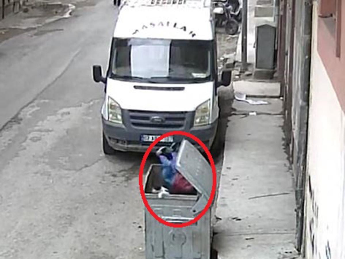 Görüntülerde çocuğun çöp tenekesinin içine düştüğü, çöpün içindeki kedinin panikle dışarı çıktığı anlar yer aldı.