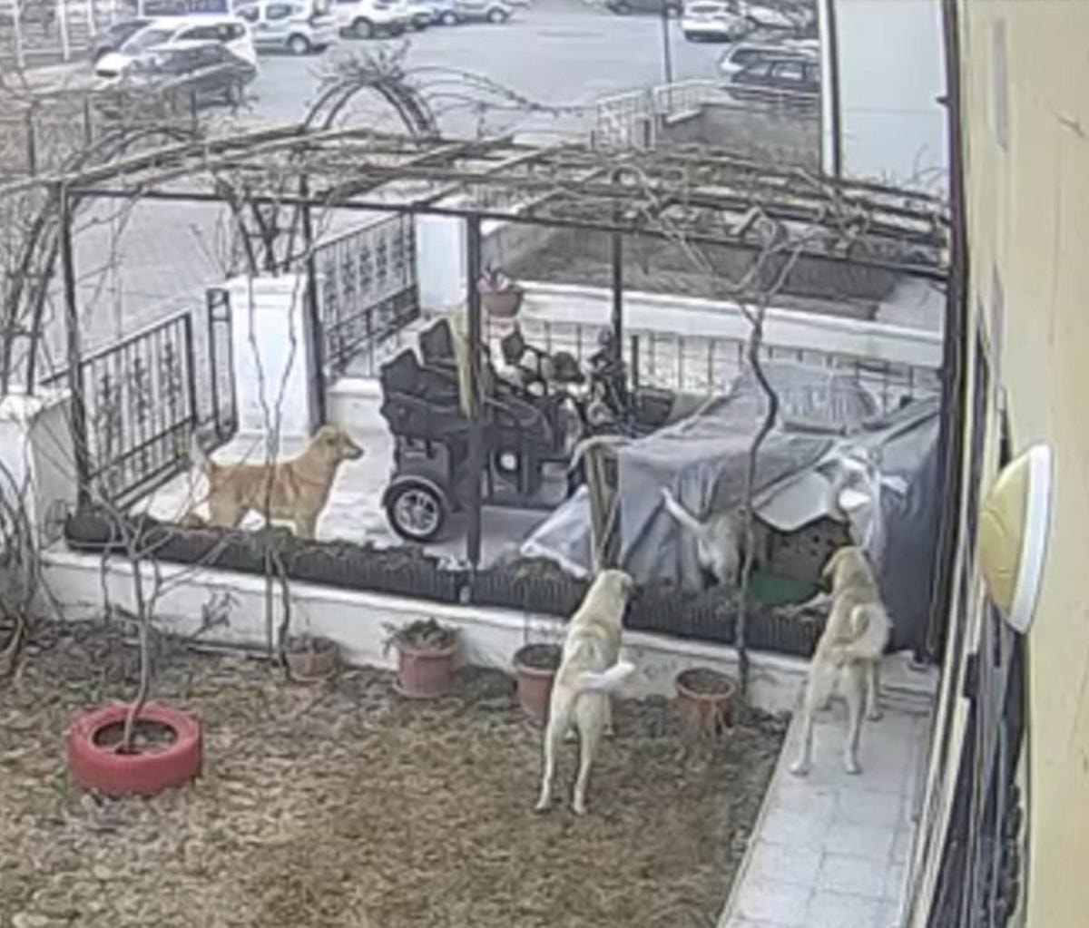 Sokak köpeklerinin saldırısına uğrayan kedi telef olurken, köpeklerin kediye saldırdığı korku dolu anlar güvenlik kamerasına yansıdı.