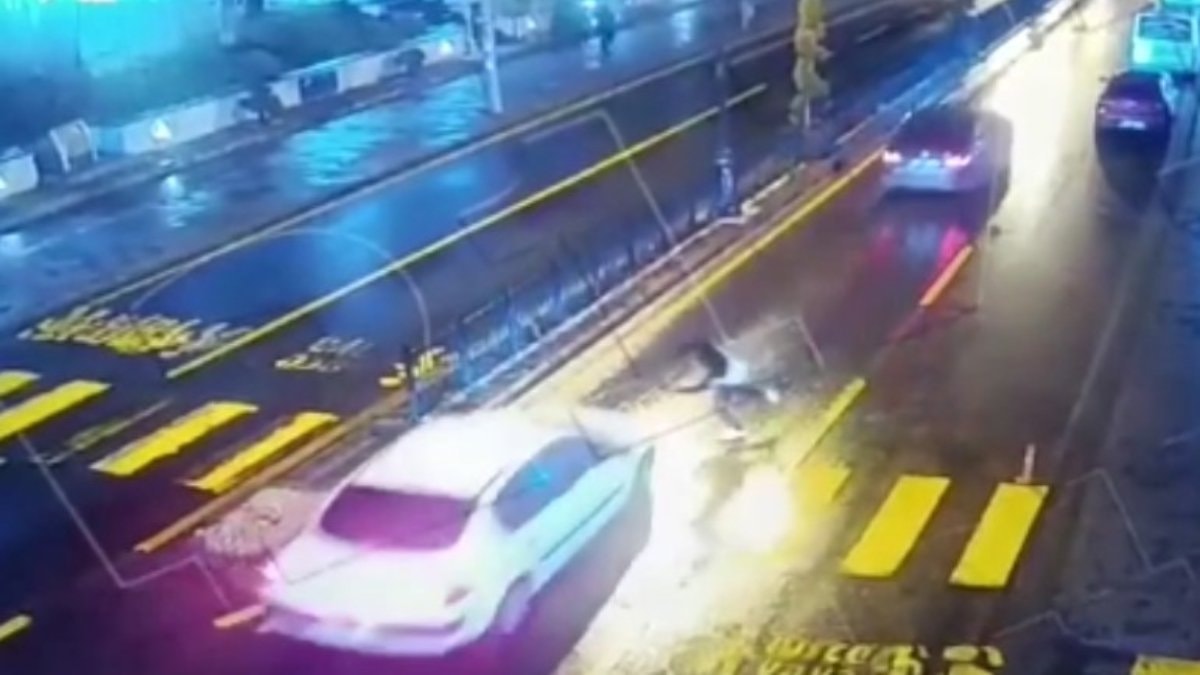 Görüntüde, V.S'nin yaya öncelikli geçitte beklediği, yaklaşan otomobilin üzerine atlayıp düştüğü görülüyor.