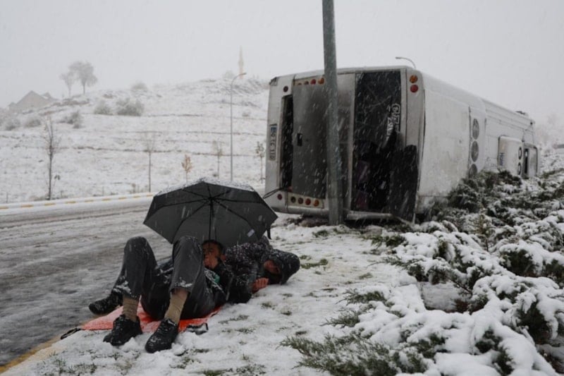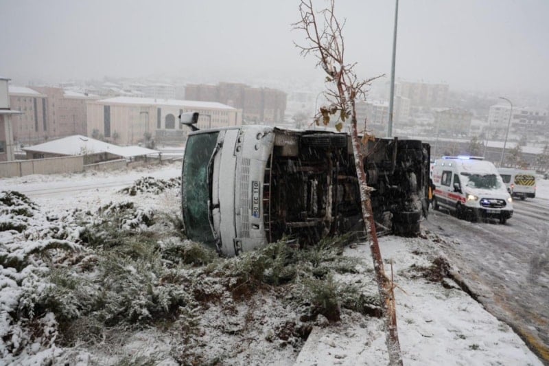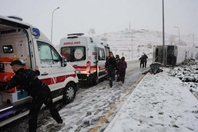 Nevşehir'de bir işçi servisi, etkili olan kar yağışı nedeniyle kayganlaşan yolda refüje çarparak devrildi. Kazada yaralanan 14 kişi hastaneye kaldırıldı.