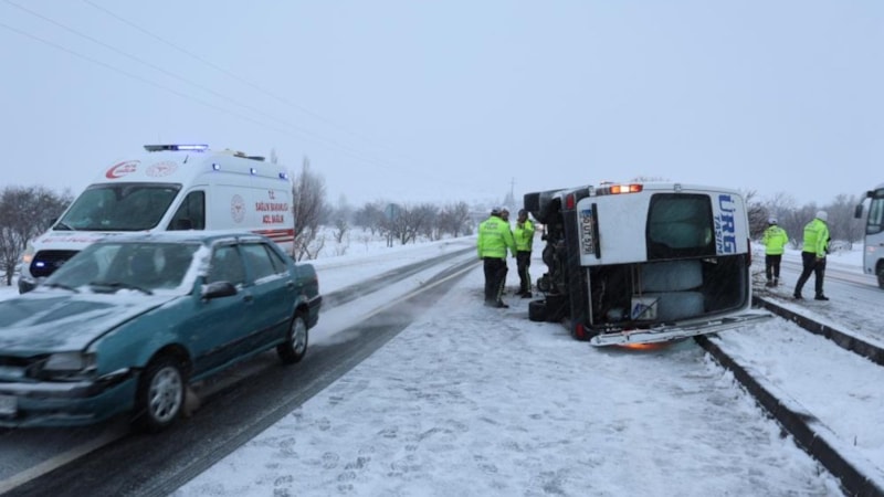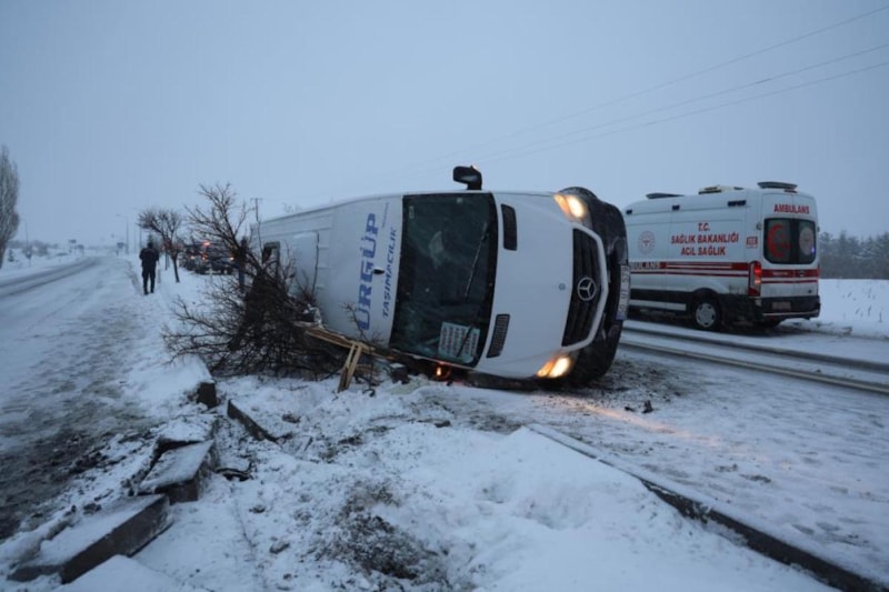 Bu akşam saatlerinde, Nevşehir Ürgüp Karayolu’nda Uçhisar Kavşağı yakınlarında meydana gelen kazada, Metin Y. yönetimindeki 50 UT 579 plakalı yolcu minibüsü, yoğun kar ve tipi nedeniyle kayganlaşan yolda kontrolünü kaybederek geri geri gitmeye başladı. Minibüs, refüjdeki kaldırım taşlarına çarptıktan sonra devrildi.