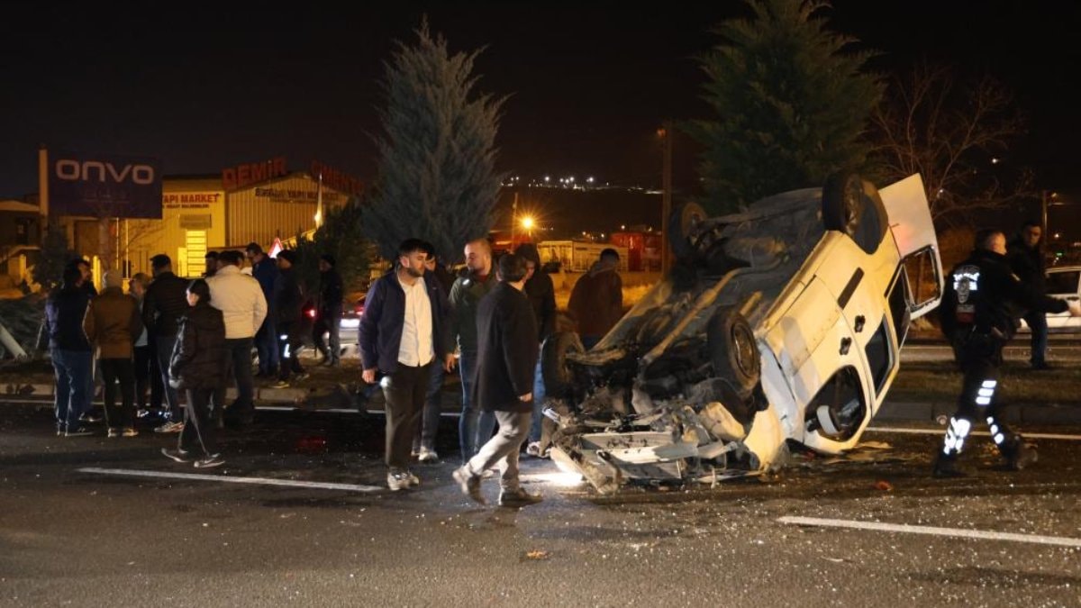 Çarpmanın etkisi ile savrulan hafif ticari araç, refüjde bulunan aydınlatma direğine çarparak takla attı.