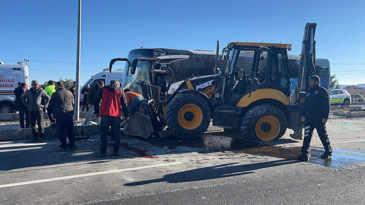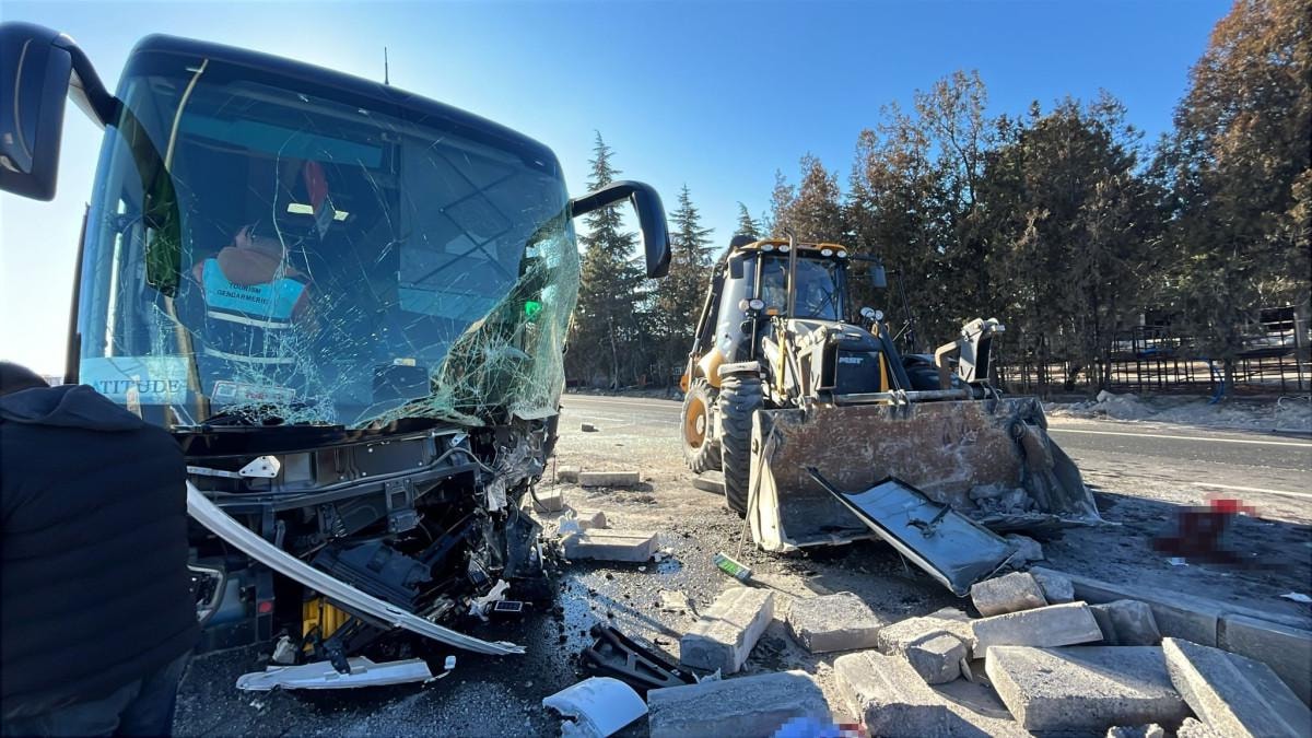 Kontrolden çıkan turist otobüsü, refüje çıkarak yol çalışması yapan iş makinesi ile kafa kafaya çarpıştı.