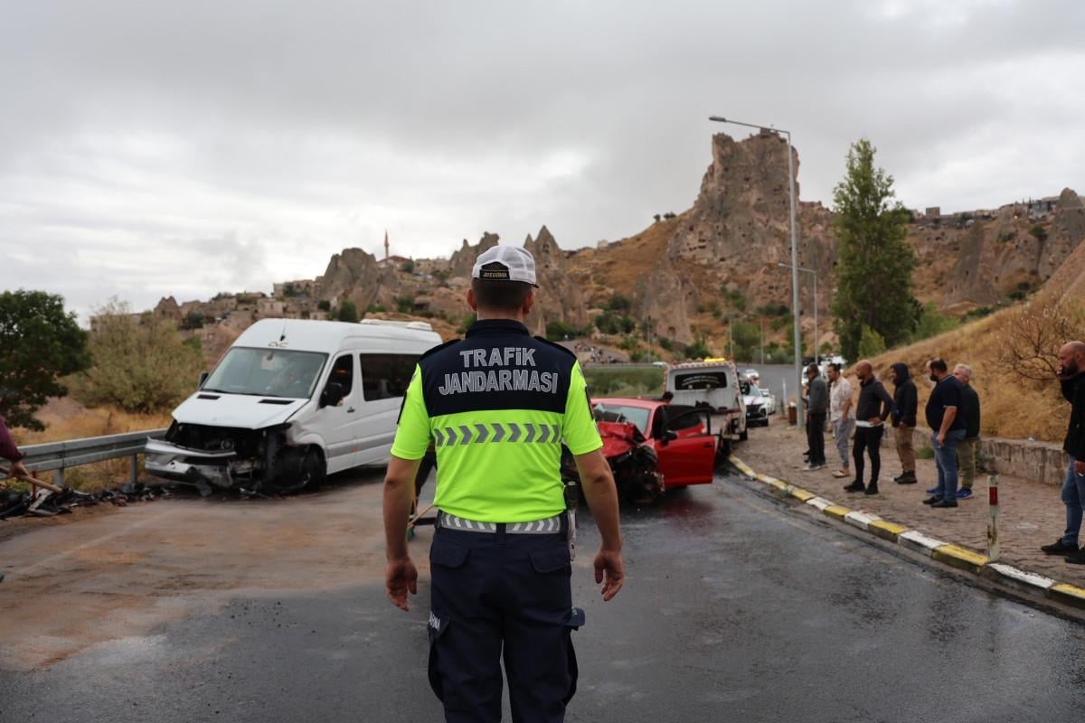 Nevşehir’in Uçhisar Beldesi Göreme yolu, Uçhisar Kalesi altında bu sabah saatlerinde aşırı yağış nedeniyle tehlikeli anlara sahne oldu. M.K. yönetimindeki 50 AEJ 140 plakalı otomobil, direksiyon hakimiyetini kaybederek karşı şeritten gelen C.K. idaresindeki 50 US 707 plakalı turist minibüsüne çarptı.