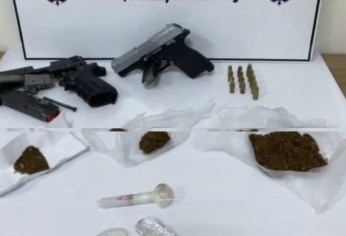 Şüpheliyle birlikte yapılan aramada; 2 adet tabanca, 2 adet şarjör, 13 adet fişek, sentetik uyuşturucu ve uyuşturucu kullanım aparatı ele geçirildi.