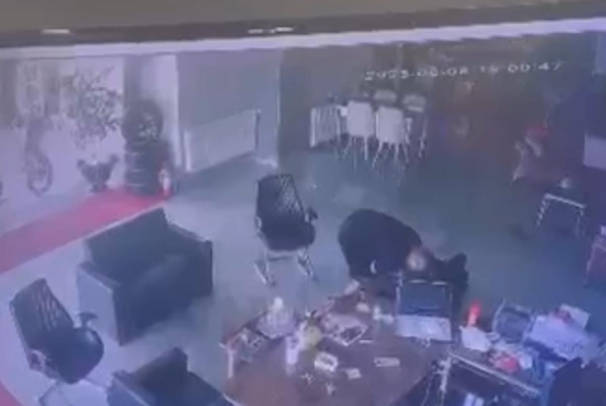 Görüntülerde, şüphelilerin iş yerine 9 el ateş ettiği, kurşunlardan birinin Ege'ye isabet etmesi üzerine galeri çalışanının, oturduğu koltuğu geriye çekerek diğer mermilerden koruduğu görüldü.