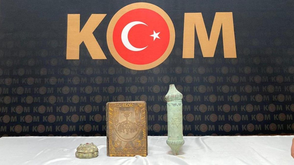Polis, araçta yapılan arama sonucu tarihi eser olduğu değerlendirilen bir kitap, deri üzerine yazılı ferman şeklinde bir belge ve üzerinde yazılar olan deri bir zincir ele geçirdi.