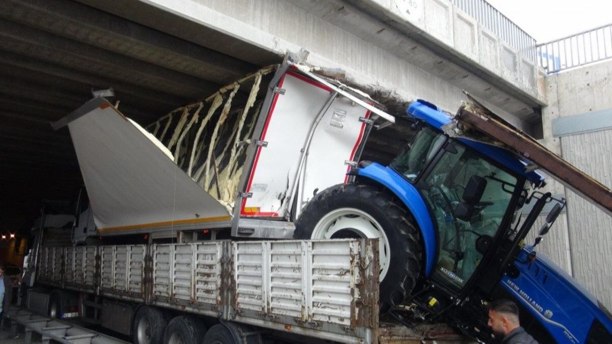 Numan Y. aracı durdururken, dorsedeki kamyonet ile traktörde hasar oluştu.