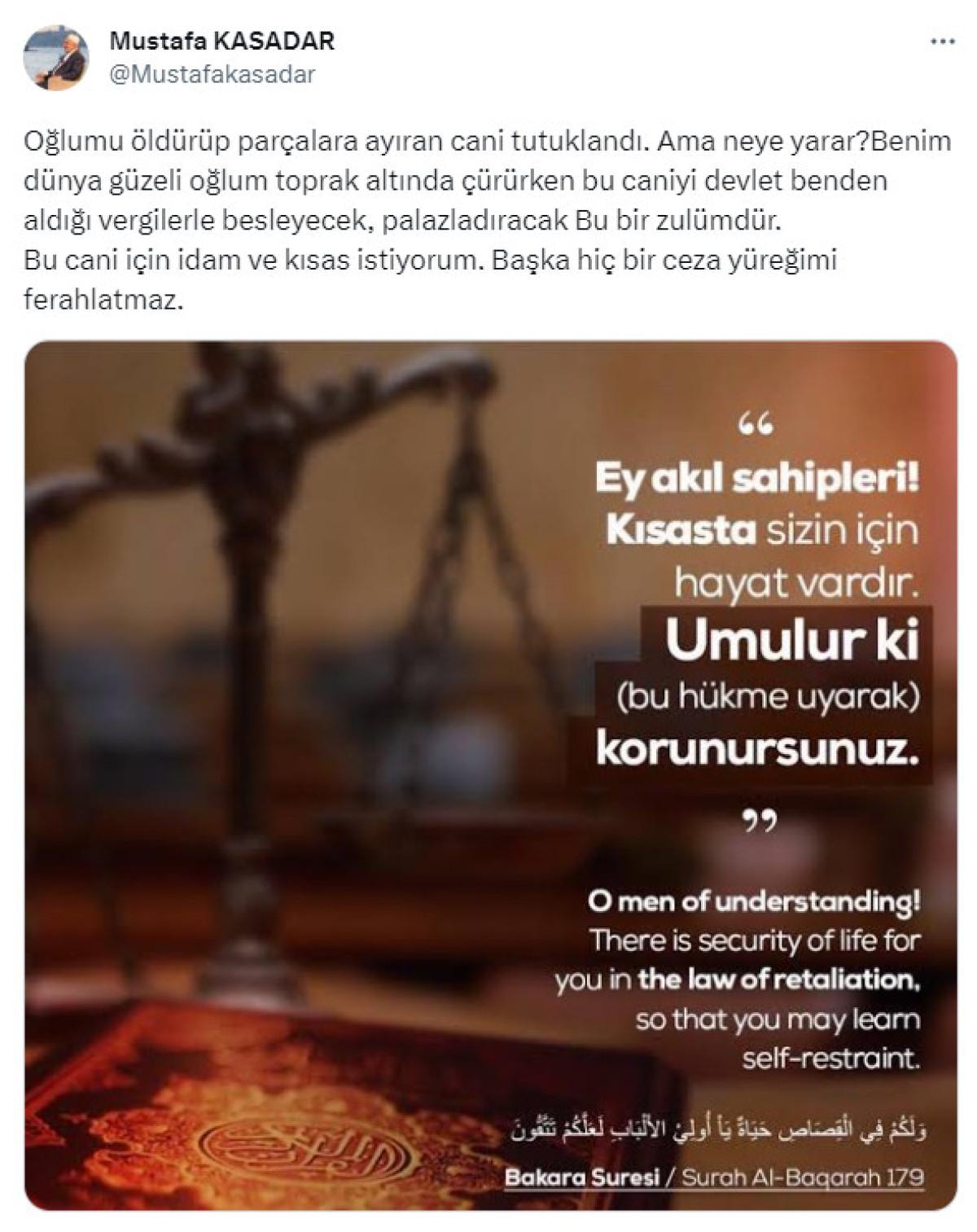 Oğlunun katilinin idamını isteyen Kasadar, şu ifadeleri kullandı: