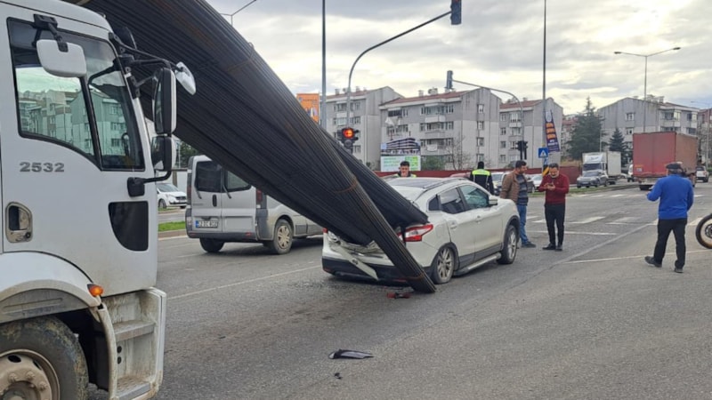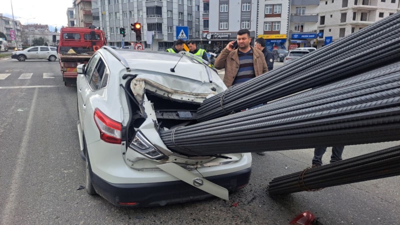 Kayarak kamyon kasasından çıkan demirler, önünde seyreden A.Y. yönetimindeki 52 ABB 650 plakalı otomobilin arka camından içeri girdi. Çarpmanın etkisiyle otomobilde büyük çapta maddi hasar oluştu.
