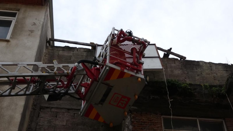 Ordu'da boş bir binanın çatı katından sarkan ve caddeye düşme tehlikesi olan reklam panosu, itfaiye ekipleri tarafından kaldırıldı.