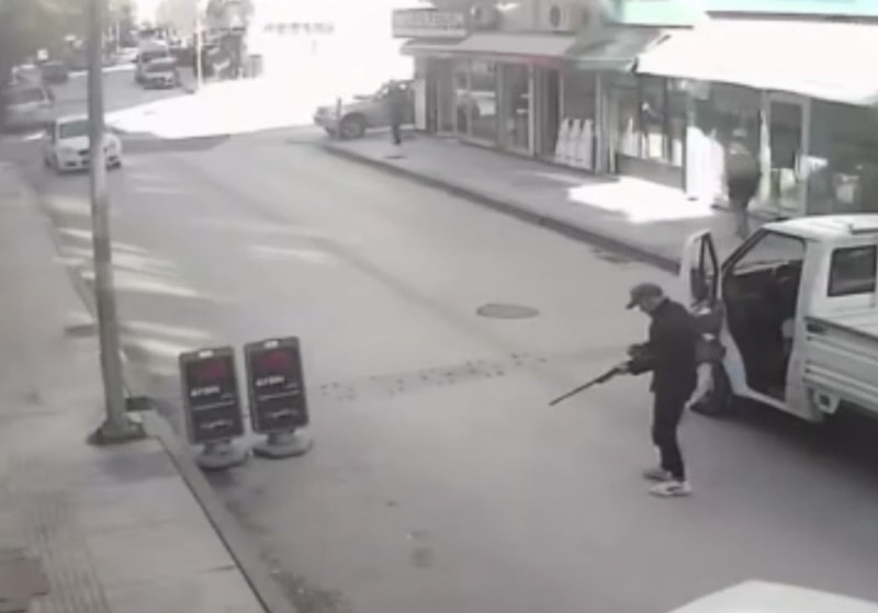 Kapalı olan iş yerinin önüne gelen kimliği öğrenilemeyen bir kişi, kamyonetiyle iş yeri önüne gelerek araçtan çıkardığı uzun namlulu tüfekle peş peşe ateş etmeye başladı.
