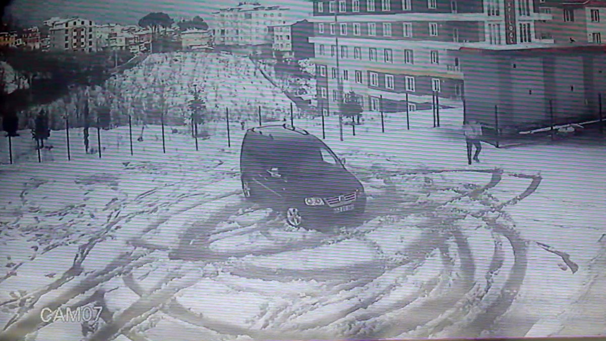 Karla kaplı okul önünde aynı saatler içerisinde farklı iki araç sürücüsü, okulun bir başka bölgesine araçlarıyla geldi. Kullandıkları araçlarla drift yapmaya çalışan sürücüleri ise yanlarında bulunan arkadaşları cep telefonlarıyla çekmeye başladı.