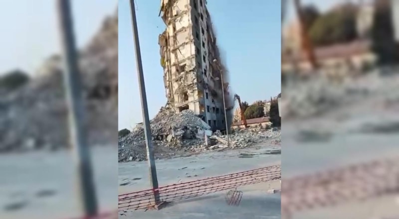 Osmaniye’de 6 Şubat depremleri sonrası orta hasarlı 11 katlı bina yıkılırken çöktü. O anlar cep telefonuyla kaydedildi.