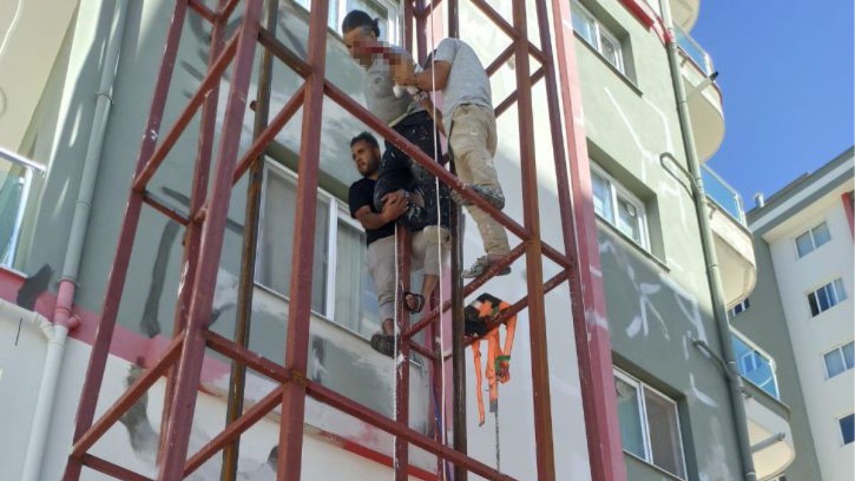Küçükgöçen, emniyet kemeri sayesinde 3'üncü katta asılı kaldı.