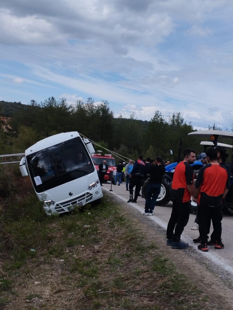 Yoldan çıkan otobüs, yan yatarak kaza yaptı.