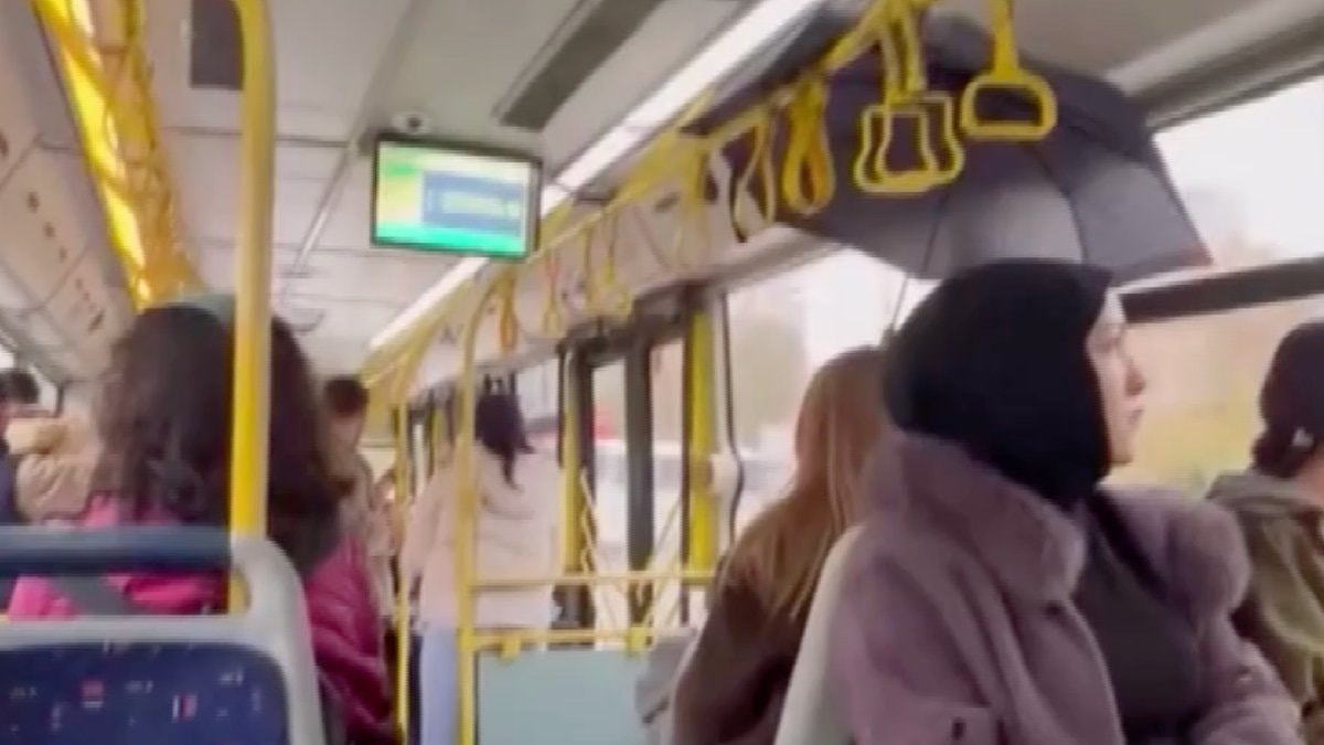 Megakent'te sağanak yağış sırasında sefer yapan otobüsünün tavanından sular akınca bir yolcu şemsiyesini açarak seyahat ederken o anlar cep telefonu kamerası ile kaydedildi.