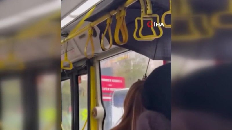 Otobüsün tavanından su aktığını gören yolcu, oturduğu yerde ıslanmamak için şemsiyesini açtı.