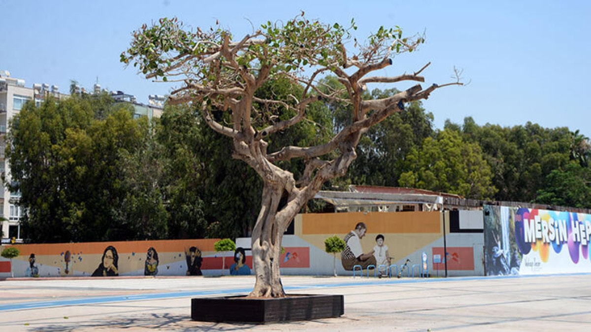 Mersin'de Adnan Menderes sahilindeki Özgecan Aslan Barış Meydanı'nın simgesi haline gelen yarım asırlık kauçuk ağacı, kök noktasından matkapla 9 delik açılıp, içine asit türevi sıvı enjekte edilerek kurutuldu.