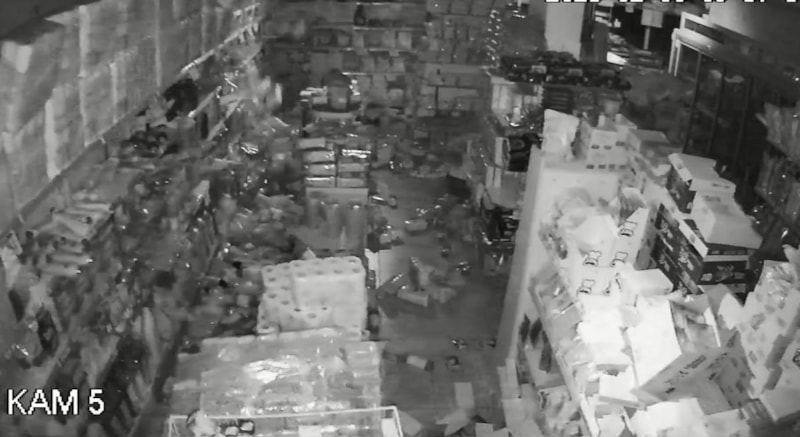 En büyük yıkıma neden olan 7.7'lik deprem anı, marketin güvenlik kamerasına yansıdı. Görüntülerde, raflardaki tüm ürünlerin sarsıntıyla düştüğü görülüyor.