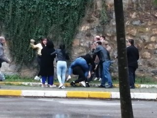 Kadınlardan biri, erkek arkadaşıyla kavga ederken yere düşen şahsa tekme ile saldırdı. Çevredeki vatandaşlar da birbirlerine tekme ve yumruklarla saldıran şahısları, ayırmaya çalıştı.