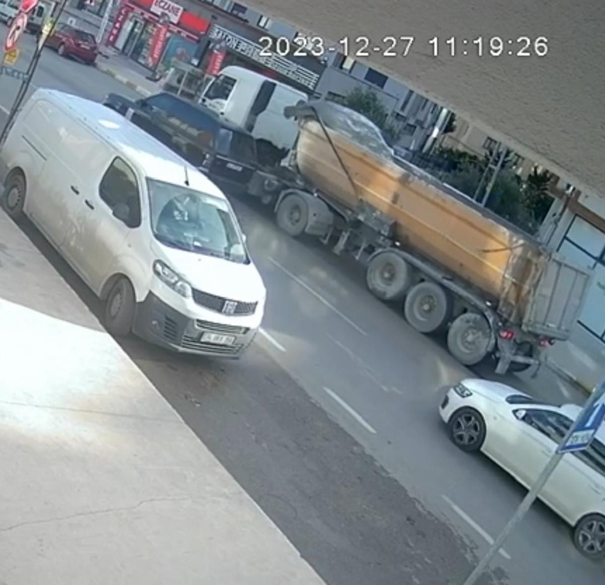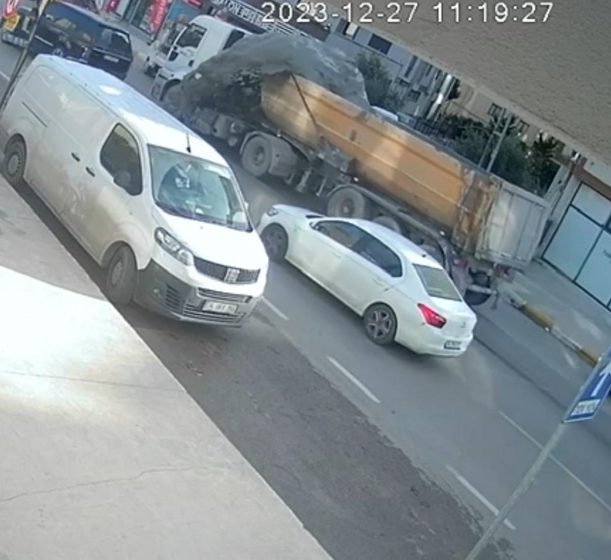 Beton yüklü hafriyat kamyonu, cadde üzerinde ilerlediği esnada park etmek üzere olan araca çarpmamak için ani fren yaptı.