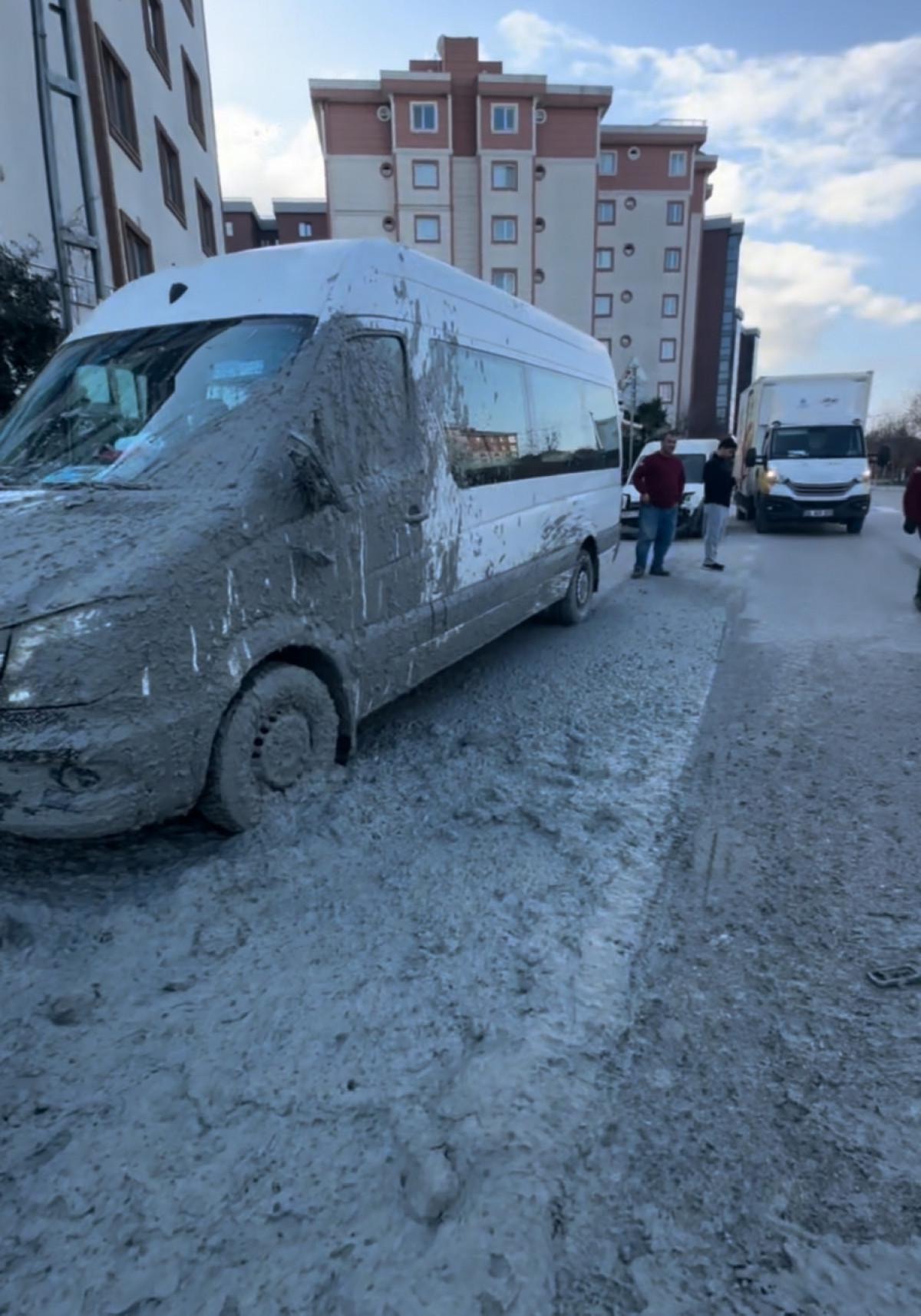 Kamyonun dorsesindeki beton, park halindeki servis minibüsü ile seyir halinde bulunan otomobilin üzerine döküldü.