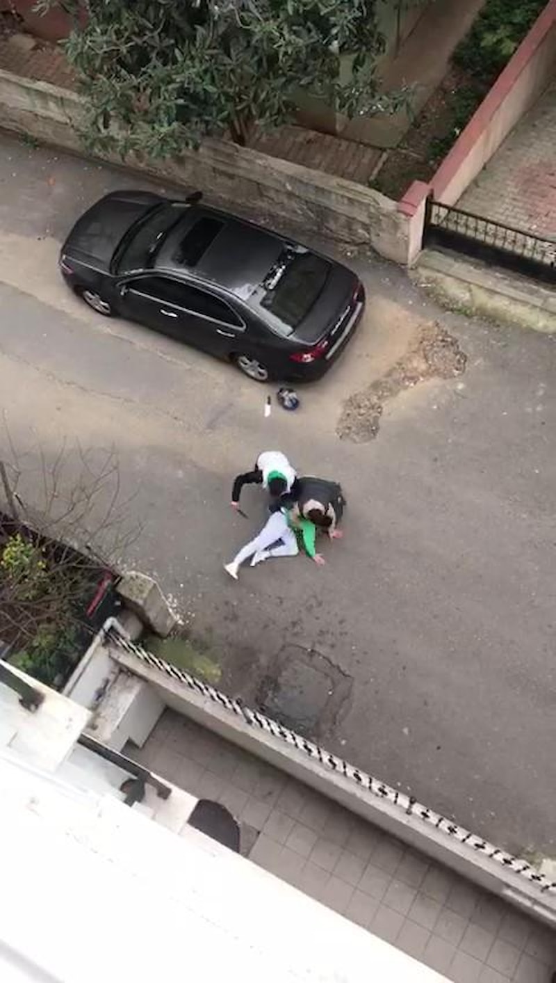 Taraflardan biri diğerine bıçakla saldırırken, karşı taraf motosiklet kaskı ile karşılık verdi.