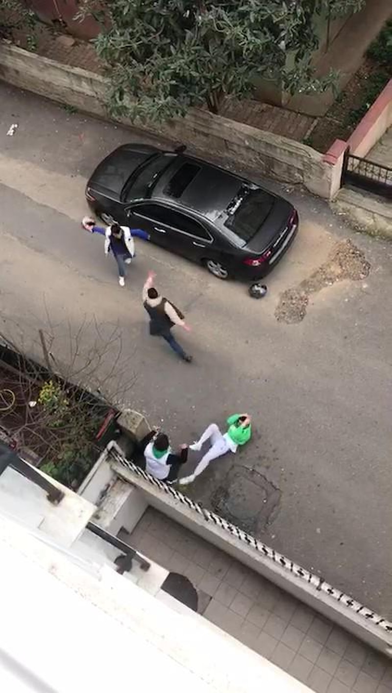 Kavgada ortalık savaş alanına dönerken, mahalle sakinleri pencerelere balkonlara döküldü.