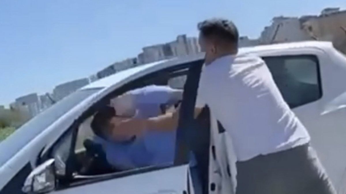Sinirlerine hakim olamayarak aracından inen tır şoförü, otomobil sürücüsünü zorla aşağı indirmeye çalıştı.