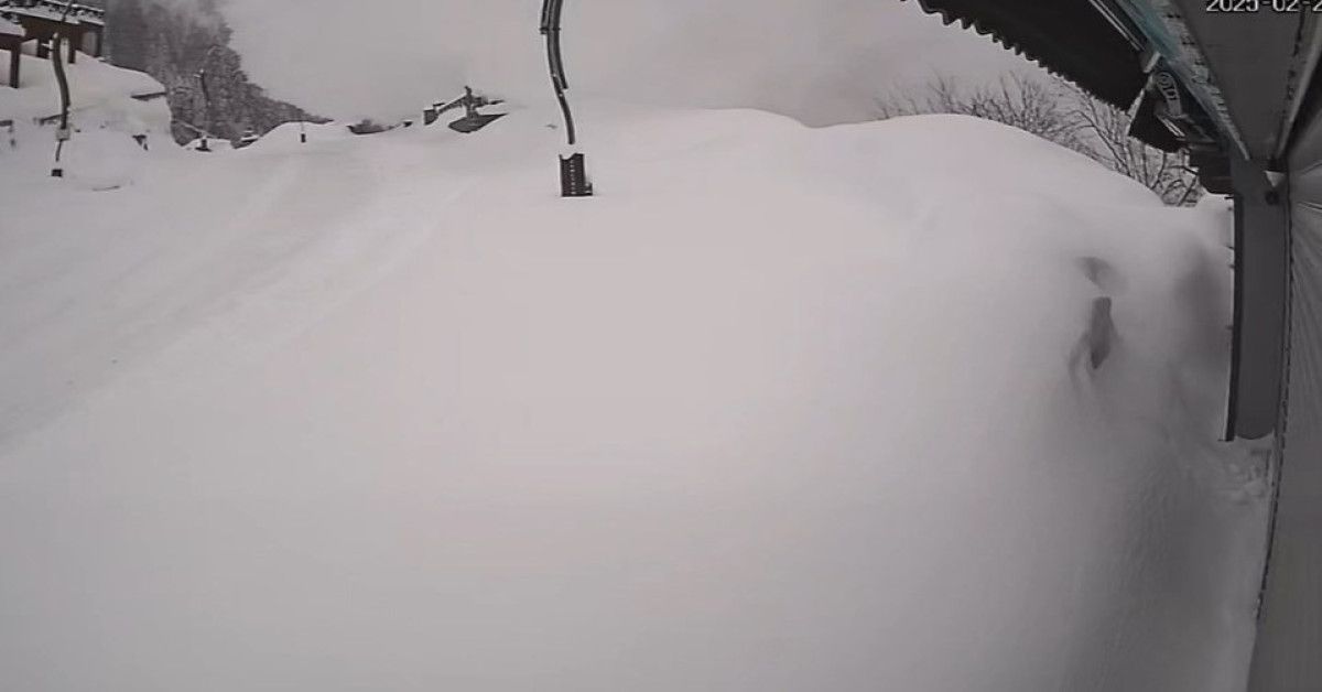Yamaçta akan kar kütlesi çevreyi beyaz dumanla kaplarken, o anlar bir işletmenin güvenlik kamerasına yansıdı.