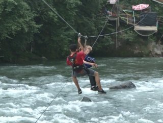 Tulum çalarak karşıya geçmek isteyen genç, o anları kaydetmesi için ve kendisini dönmemesi için sabit tutması için yanına da 2 arkadaşını daha aldı ve metrelerce uzunluktaki zipline hattından karşıya geçerken tulum çaldı.