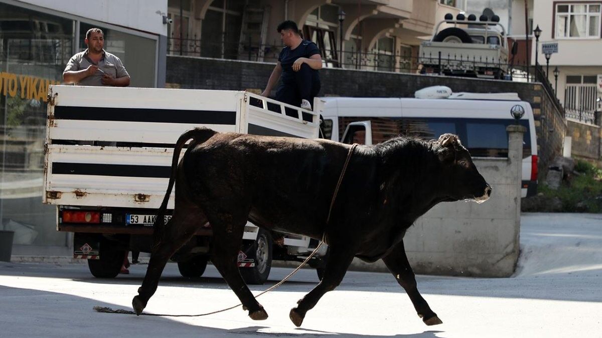 AA'nın haberine göre kurbanlık boğa, yaklaşık bir saat süren mücadelenin ardından iğne yardımı ile sakinleşti. Bulunduğu yerde kesilen boğa, daha sonra ilkel teleferik yardımı ile yola ulaştırıldı.