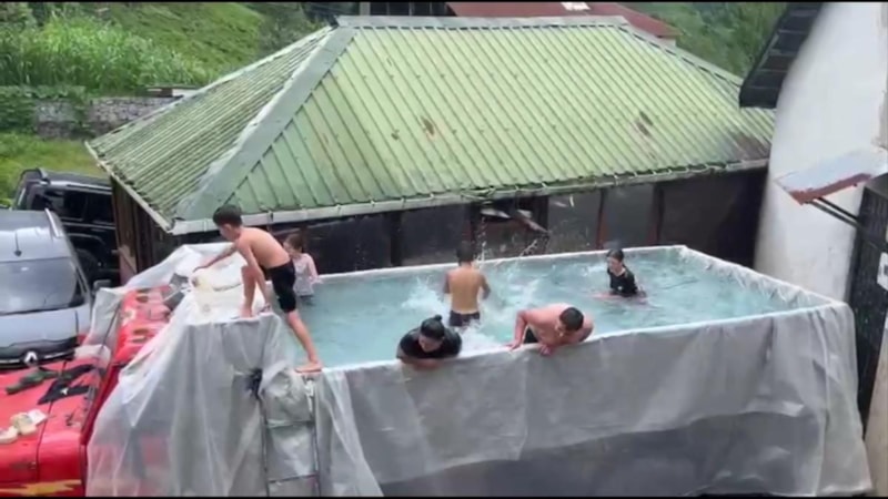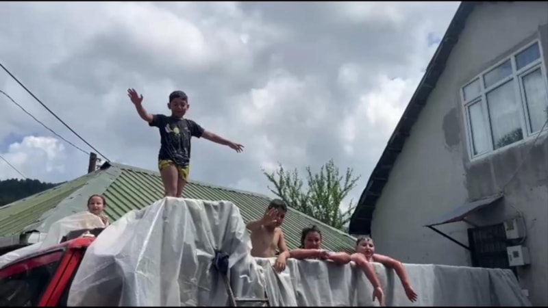 Sofuoğlu'nun kendi ve köyünden topladığı çocuklar, 1 metre derinliğindeki havuza atlayıp, yüzerek serinledi.