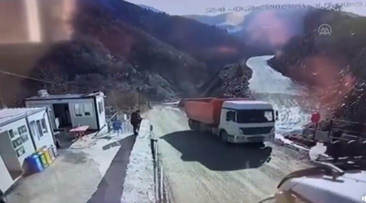 Görüntülerde; Murat O.'nun kamyonuyla geri manevra yaparak olası çarpışmadan saniyelerle kurtulduğu, hızla gelen diğer kamyonun ise devrildiği görülüyor.