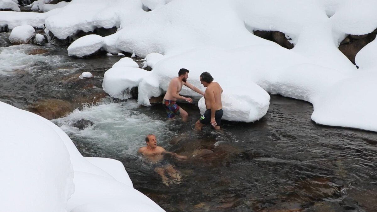 7’nci Kış Yüzme Şenliği için vadide toplanan katılımcılar, kara aldırış etmeden kendilerini Fırtına Deresi’nin buz gibi suyuna bıraktı.