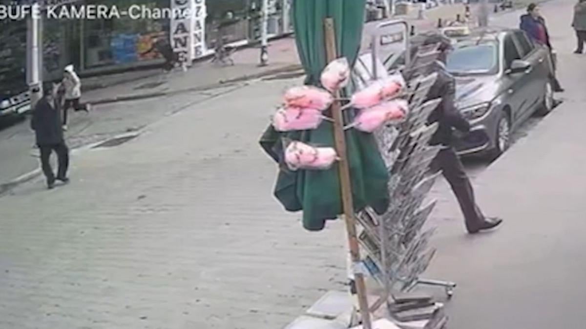 Köpekten kaçmaya başlayan çocuk, başka bir köpeğe takılıp yere düştü. Yere düştüğü esnada yoldan geçen aracın sürücüsü çocuğu fark edip hemen durdu.