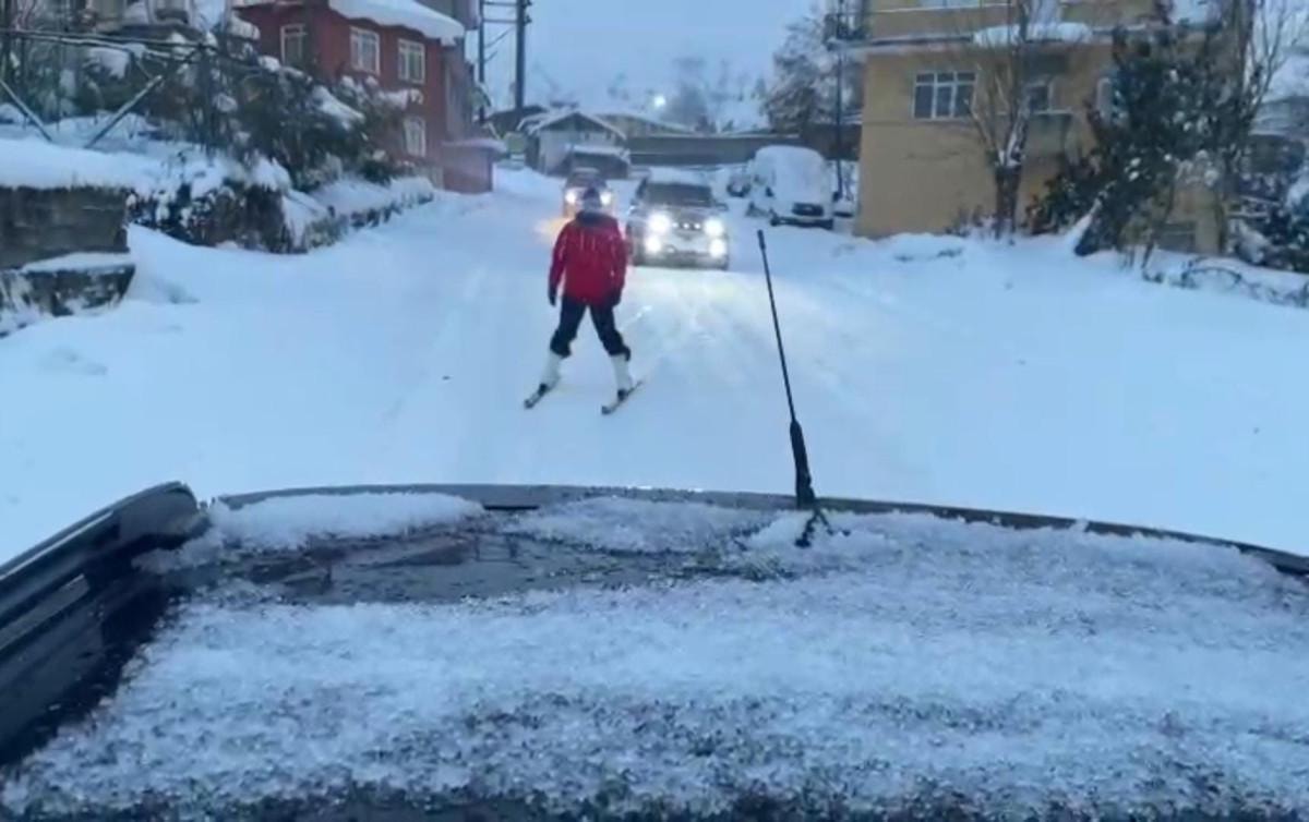 Rize'de Azaklıhoca köyünde bakkala gitmek ihtiyacı duyan Yasin Çapoğlu, karlı yolu da fırsat bilerek kayak takımlarını çıkardı.