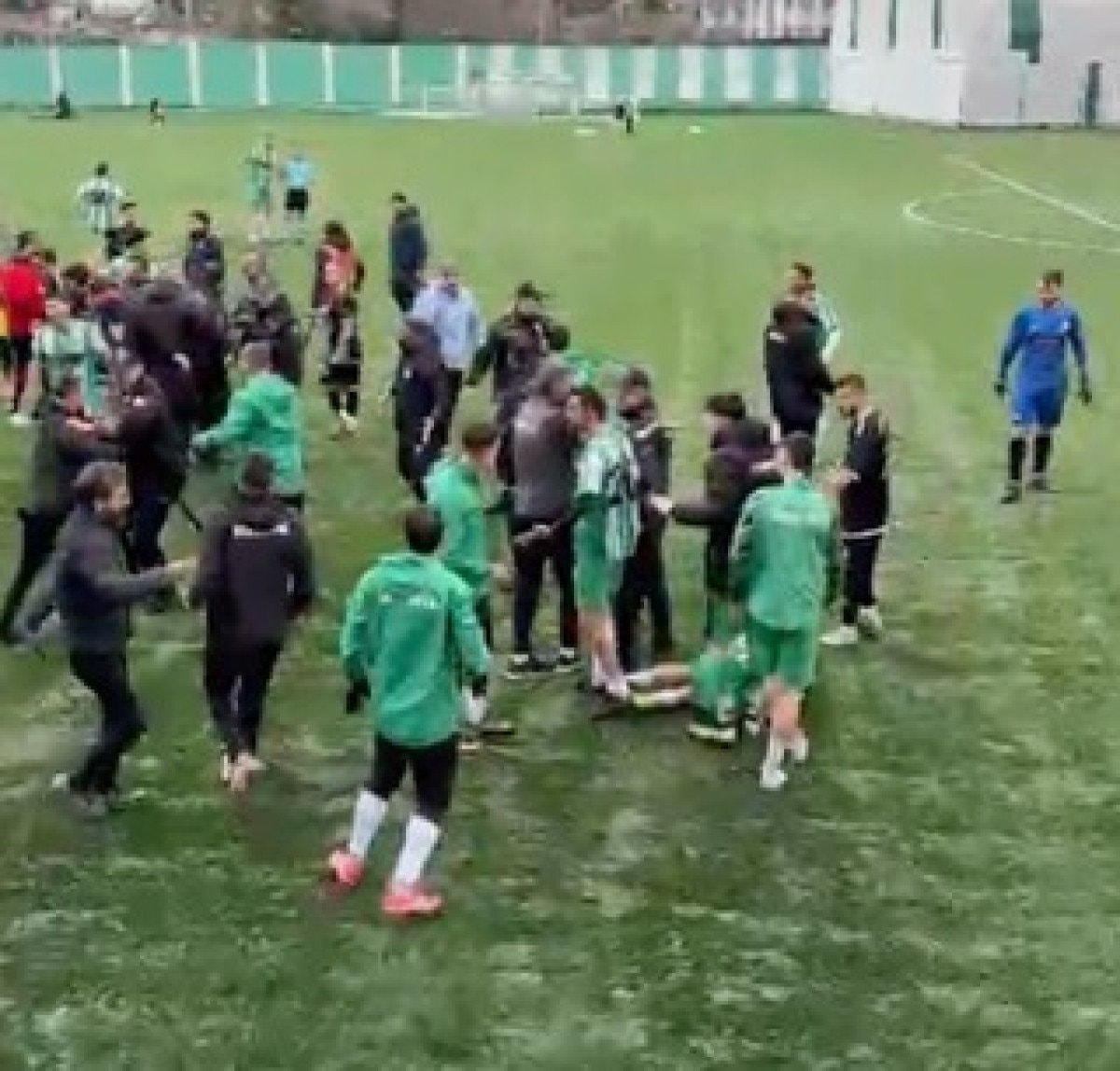 Rakiplerin birbirine tekme ve yumruk attığı kavgada iki oyuncu arasında kalan hakem de yere düştü.