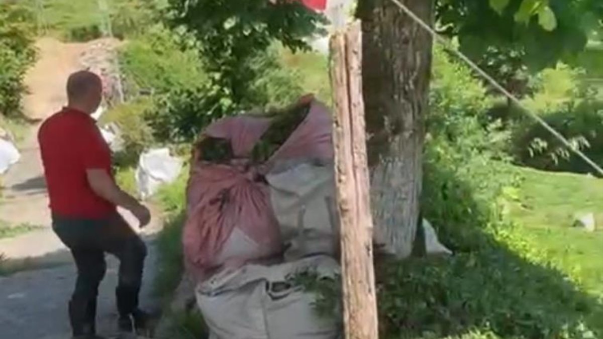 Yokuş yukarıya çıkarmak zorunda olduğu çay bezlerine bir ip bağlayan Rizeli çay üreticisi, ipin diğer ucunu ise kamyonetin kasasına bağlayıp, çayını yokuş olan tarım arazisinden çekerek çıkardı.