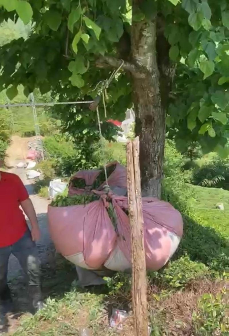 Çayı çekebilmek için ise ağaca makara sistemi kurdu. O anları da cep telefonu kamerasıyla kaydederek sosyal medyada paylaşan üreticinin bu paylaşımı büyük beğeni topladı.