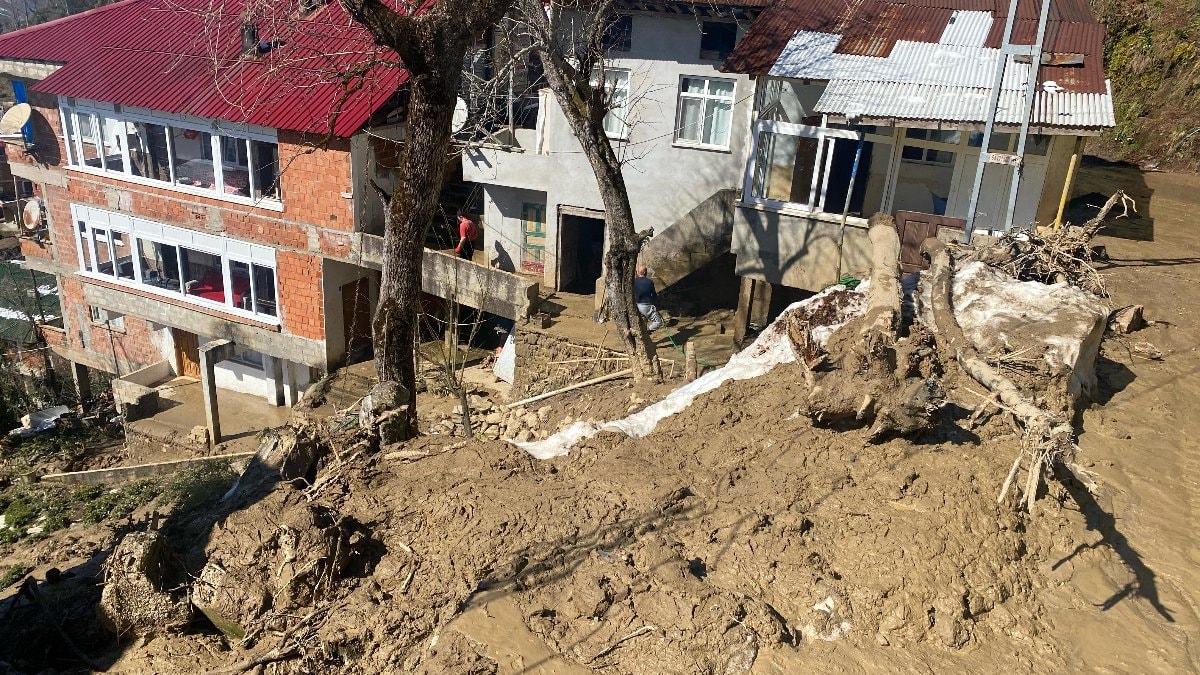 Toprak kütlesi ile çamur, yolun altında yer alan 6 eve zarar verdi, köy yolu ulaşıma kapandı.