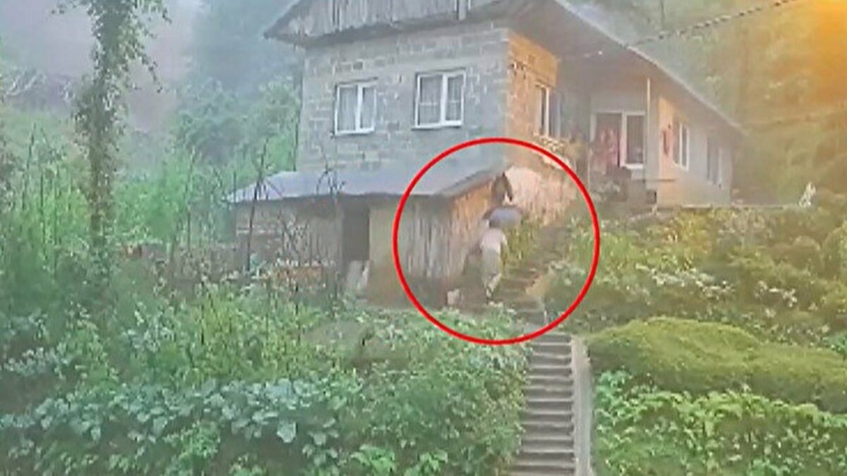 Görüntülerde, yağışın ardından Gülizar ve Metin Karali çiftinin tedirgin şekilde evlerini boşalttıkları sırada, heyelan ve selin geliş anı görüldü.