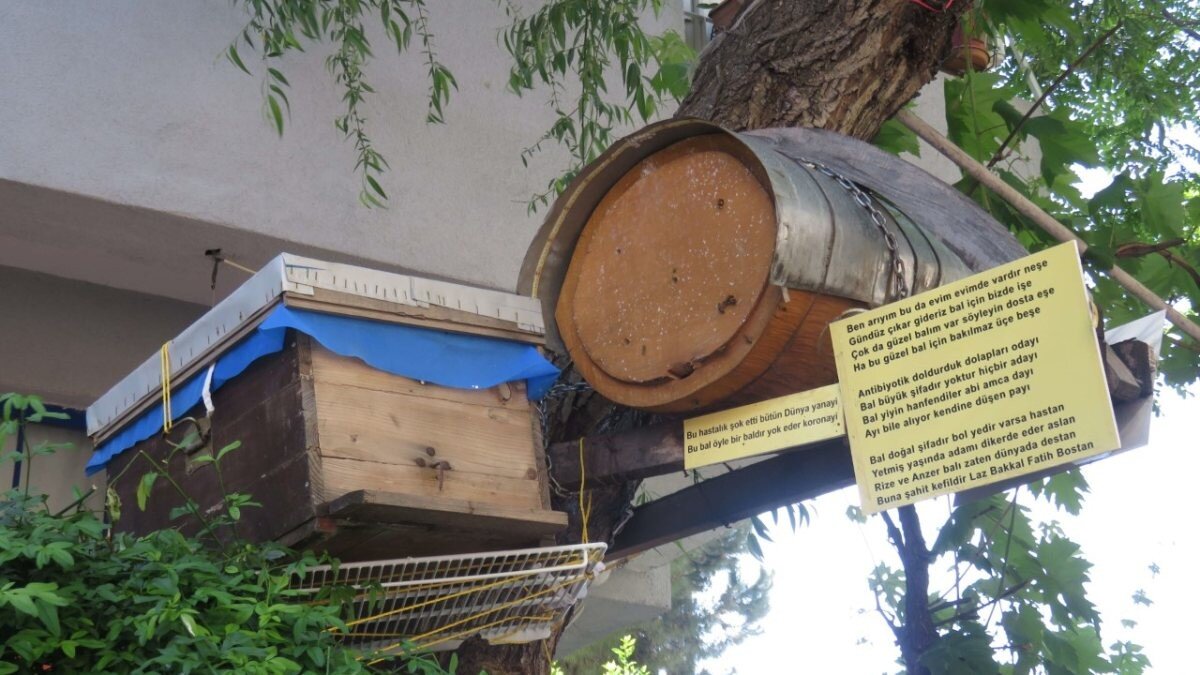 İstanbul’un Kadıköy ilçesinde bakkal dükkanı işleten Fatih Bostan isimli bir vatandaş, baba mesleğini devam ettirmek için dükkan önündeki ağaca arı kovanı kurdu.