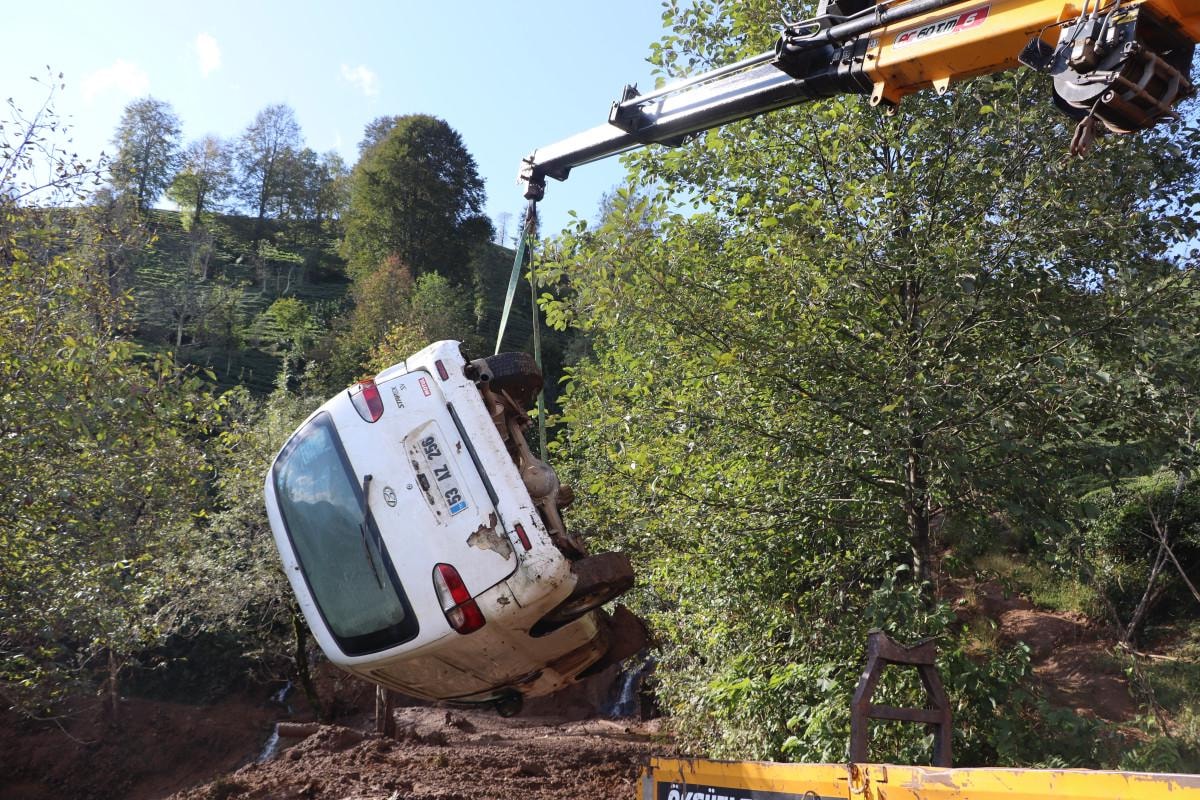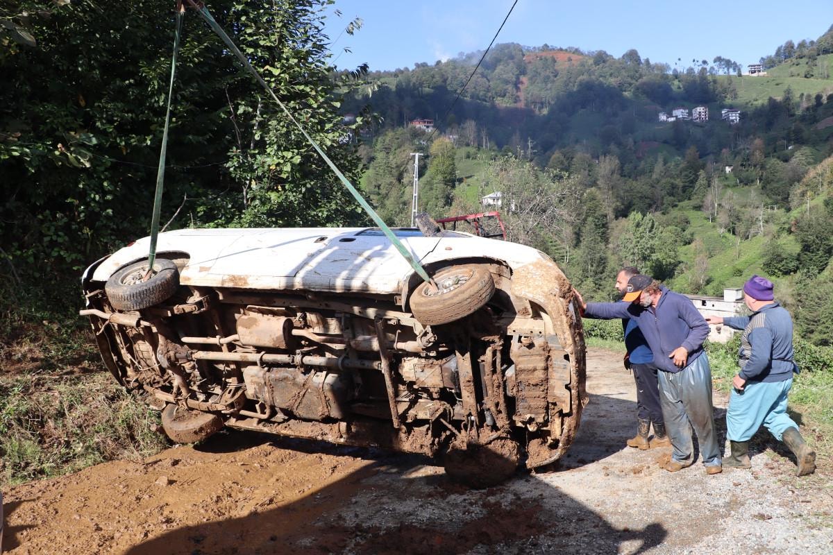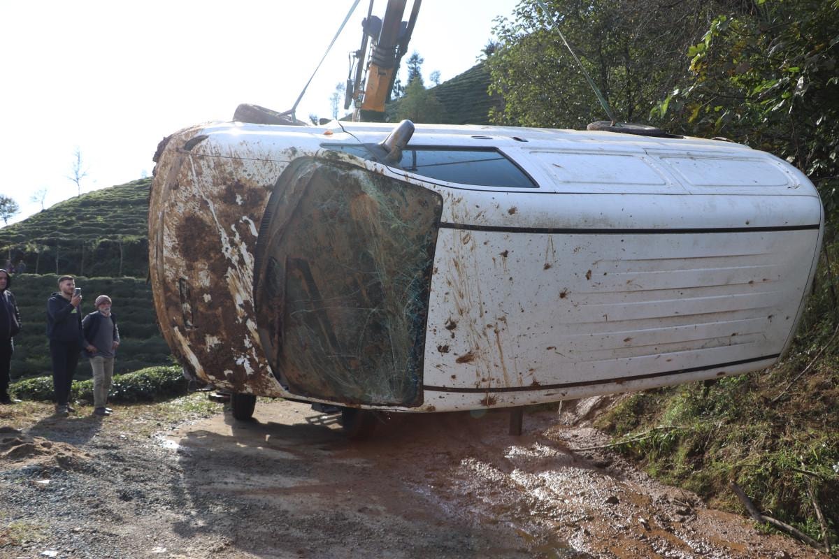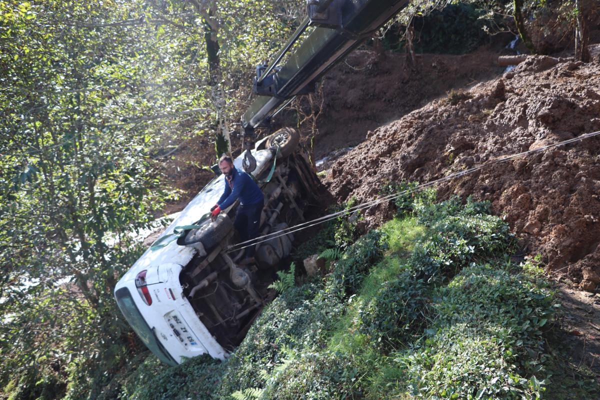 Yol kenarında park halinde olan Adem Birinci’ye ait 53 AZ 256 plakalı minibüs, yukarıdan gelen balçık nedeniyle yolun alt kısmında bulunan çay tarım arazisine yuvarlandı.
