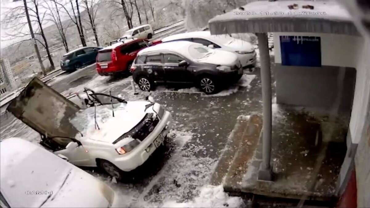 Adam ezilmekten son anda kurtulurken, beton parçası arabasının üzerine düştü. Araç, darbenin etkisiyle neredeyse ortadan ikiye ayrılarak kullanılmaz hale geldi.
